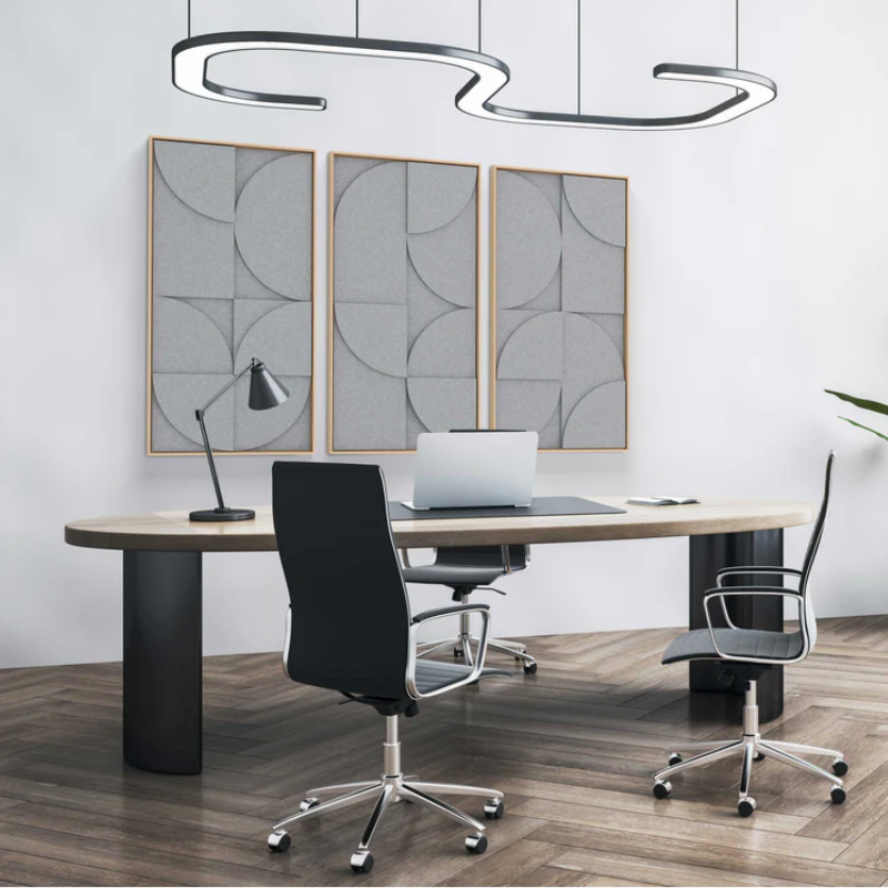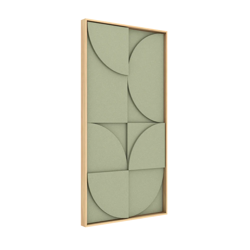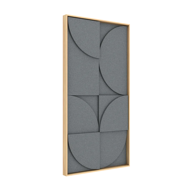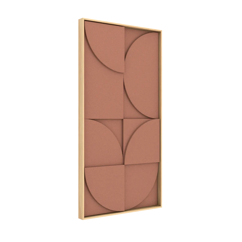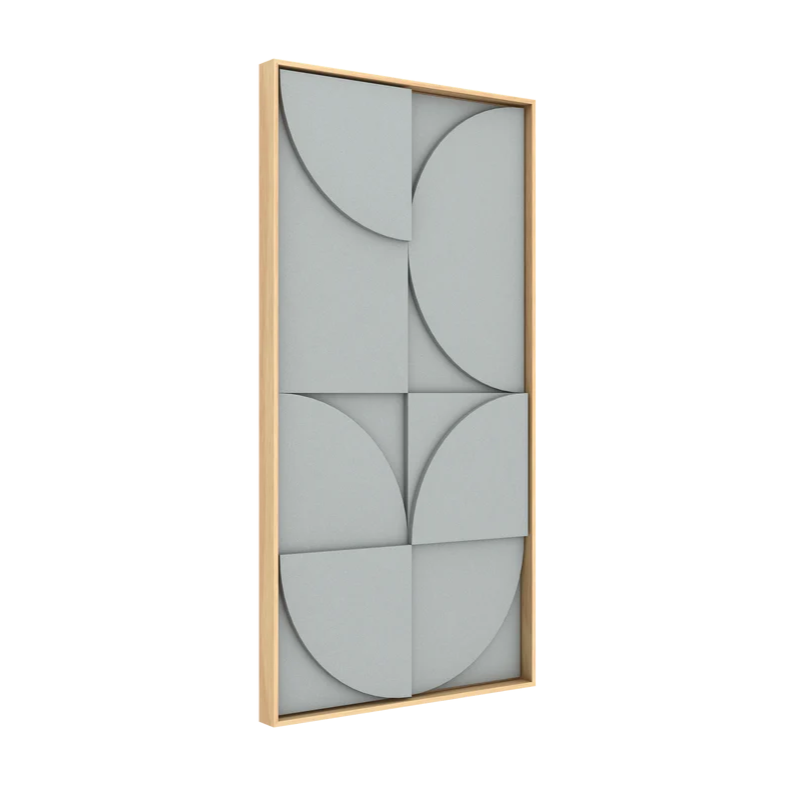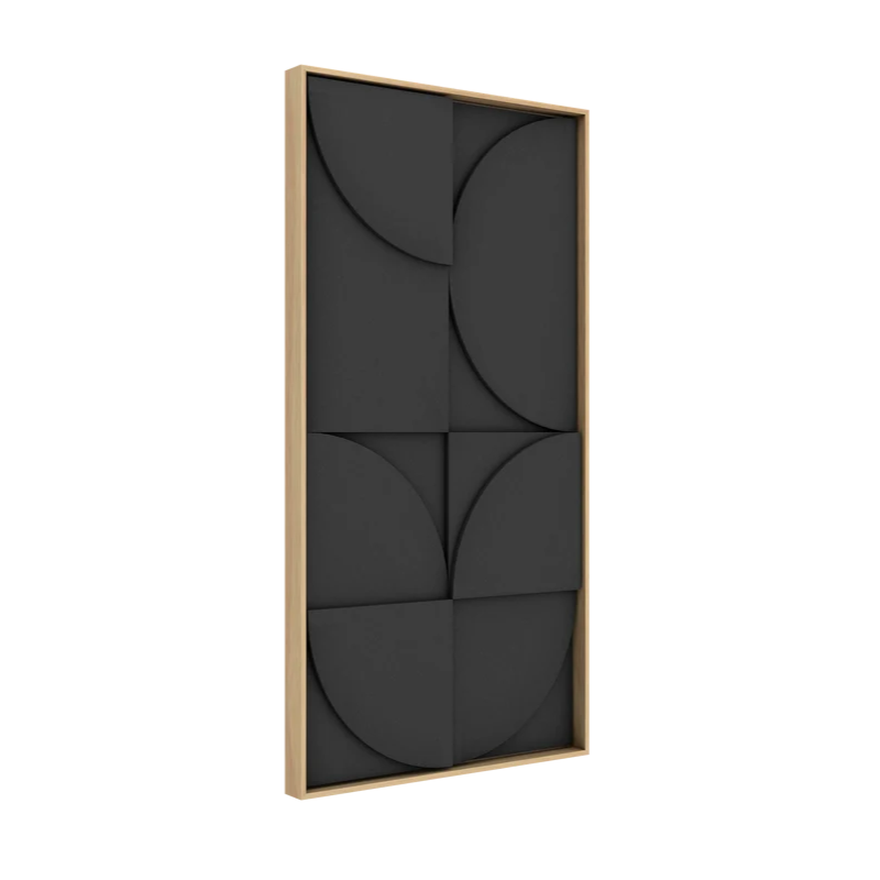 Il singolo VicShape 3D è un pannello artistico in rilievo realizzato con tre strati di PET HD per l'assorbimento acustico, incorniciato in una cornice di alta qualità in impiallacciatura di rovere naturale.